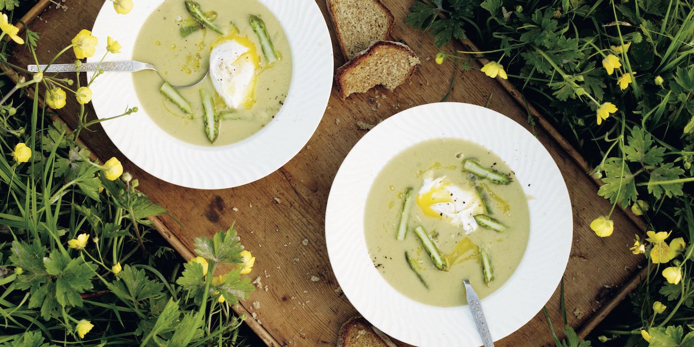 8. Serve the soup into a bowl, add the asparagus tips and a poached egg to each bowl. Add 1 tbsp tvaroh to each bowl as well.
